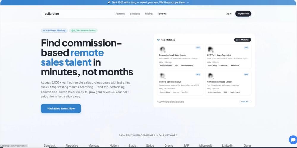 sellerpipe is a specialized recruitment platform designed to connect companies with commission-based remote sales professionals. The platform streamlines the hiring process by providing access to a large pool of pre-verified sales talent, enabling businesses to scale their sales teams efficiently without traditional employment overhead.